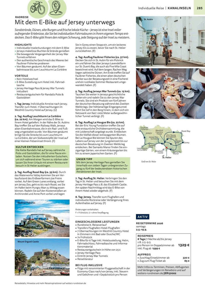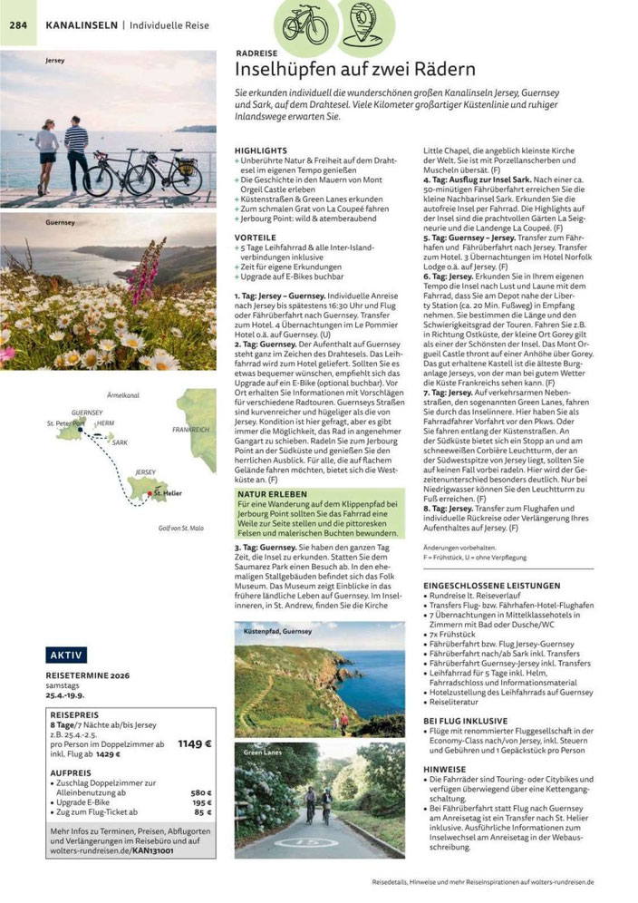 Die Kanalinseln eignen sich gut für die Erkundung per Rad. Es gibt viele verkehrsberuhigte "Green Lanes". Drei Beispiele einer vorgebuchten Radtour:
